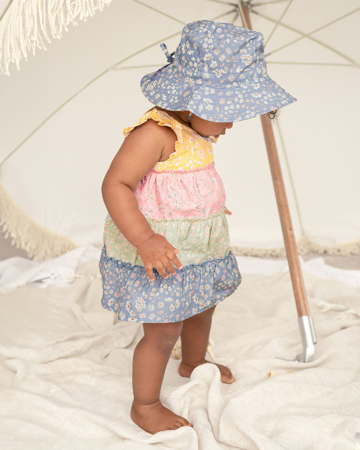 Toshi Bell Hat Eva is a flattering and feminine bell shaped hat. A UPF 50 + UV rating is provided in colourway Dusk. The baby sunhat is crafted from the finest quality 100% cotton. The head tie offers adjustable sizing and a chin tie secures the hat. The sunhat is fully lined for increased comfort. Pretty styling is created with a softly frilled border.