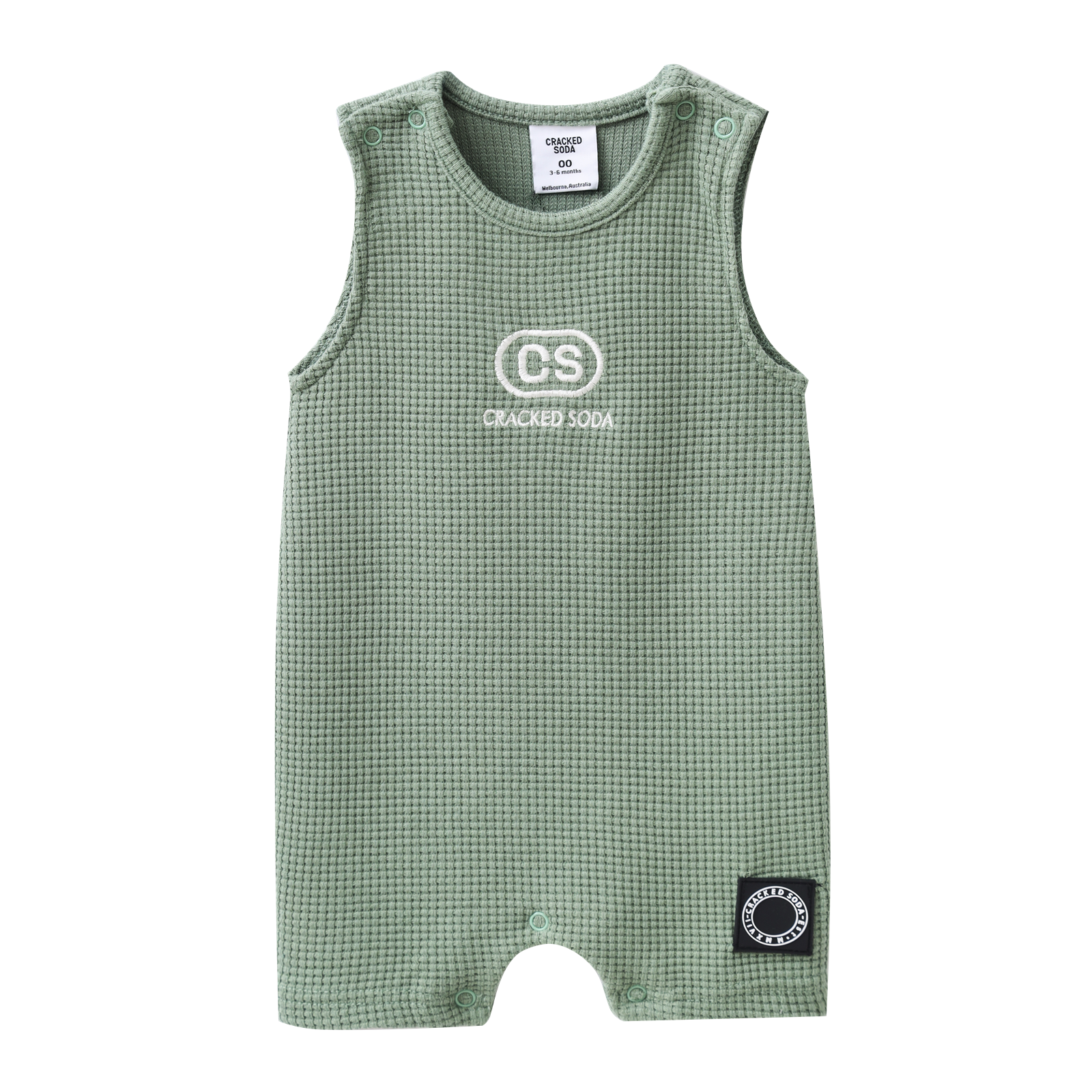 The Flint Textured Romper in olive combines practicality and style, featuring shoulder and inner leg snaps for ease of wear. Its textured fabric enhances visual interest, while the embroidered CS logo adds a distinctive touch. This versatile piece offers numerous outfit combinations, balancing comfort with convenience for daily wear.