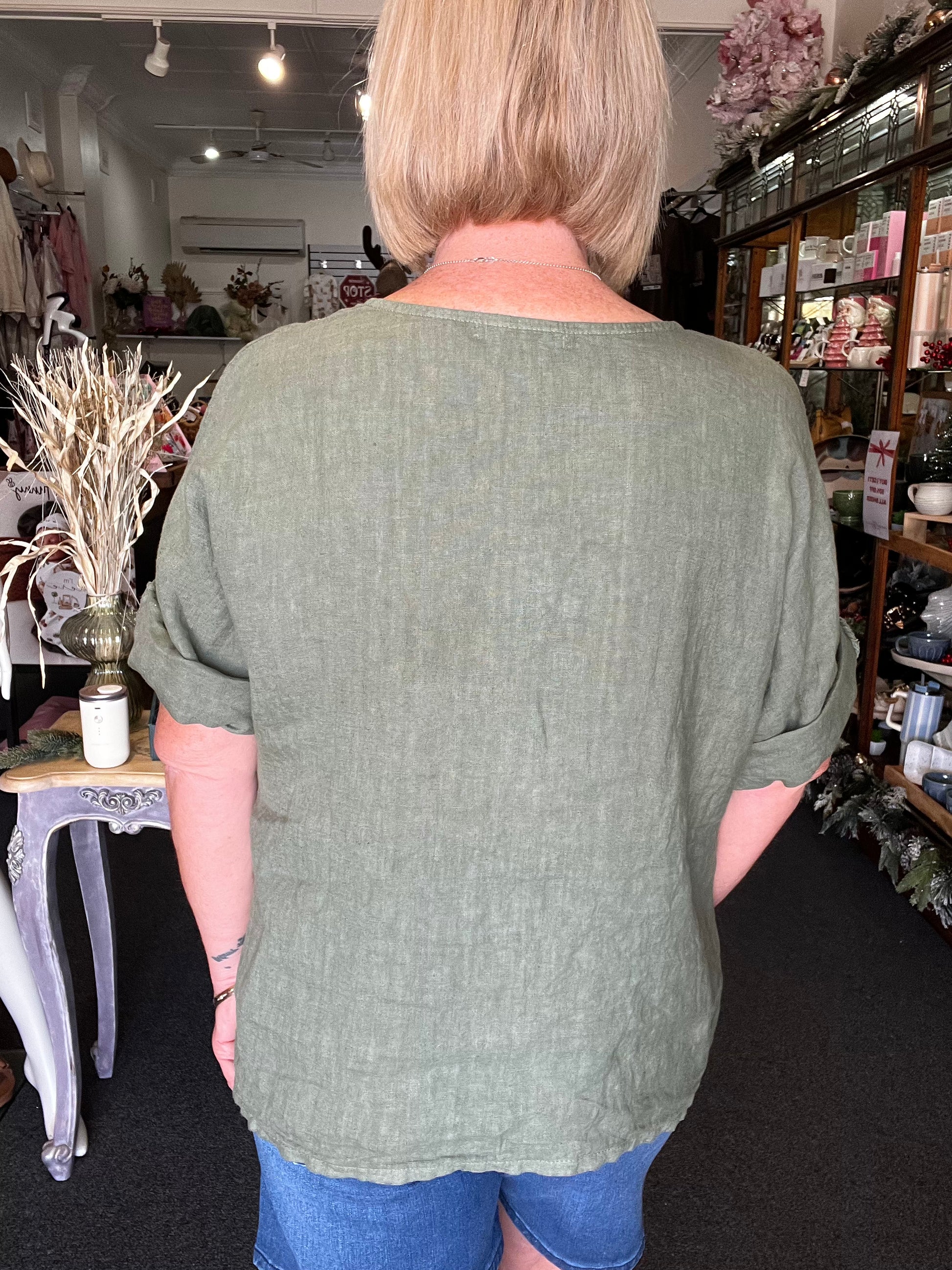 Expertly crafted in Italy, this 100% linen top combines luxury with versatility. The V-neck and drawstring down the front offer a flattering fit, while the short sleeves make it perfect for any occasion. Elevate your wardrobe with this must-have Italian Linen Top in a stylish khaki color.