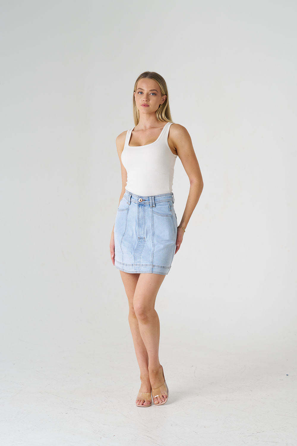 Introducing the Maeve Denim Skirt, a must-have for any fashion-forward wardrobe. Made from soft stretchy denim, this short skirt features 2 front and back pockets, tan stitching, and a brass button and belt tab for added style. Made of 89% cotton, 9% polyester, and 2% spandex, it offers comfort and durability for all-day wear. Upgrade your look with this versatile and chic piece.